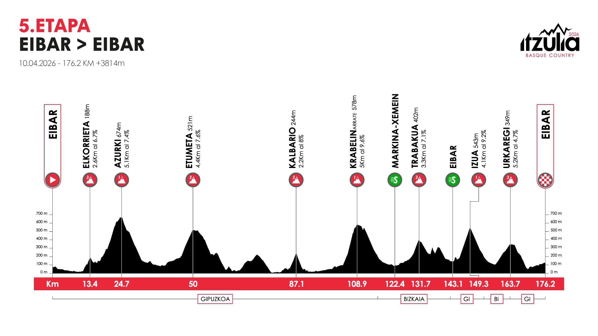 Es la jornada más dura de la edición. Los 176,2 kilómetros y los 3.841 metros de desnivel positivo, junto al terreno habitual de Eibar, la convierten en el gran día para la clasificación general.