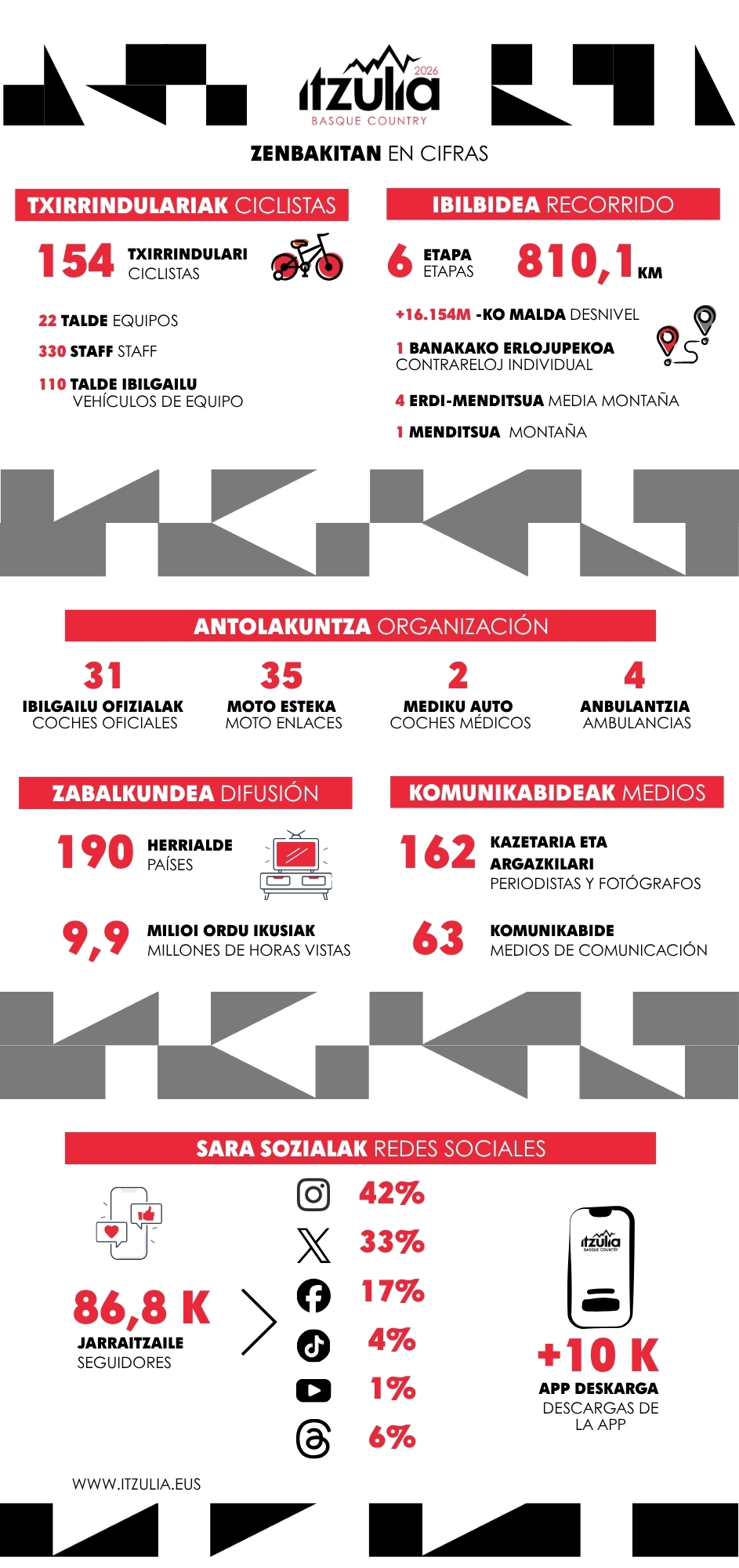 En el entorno digital, la comunidad de la prueba continúa ampliándose. Las redes sociales de la Itzulia suman 86.800 seguidores, mientras que la aplicación oficial de la carrera supera las 10.000 descargas.